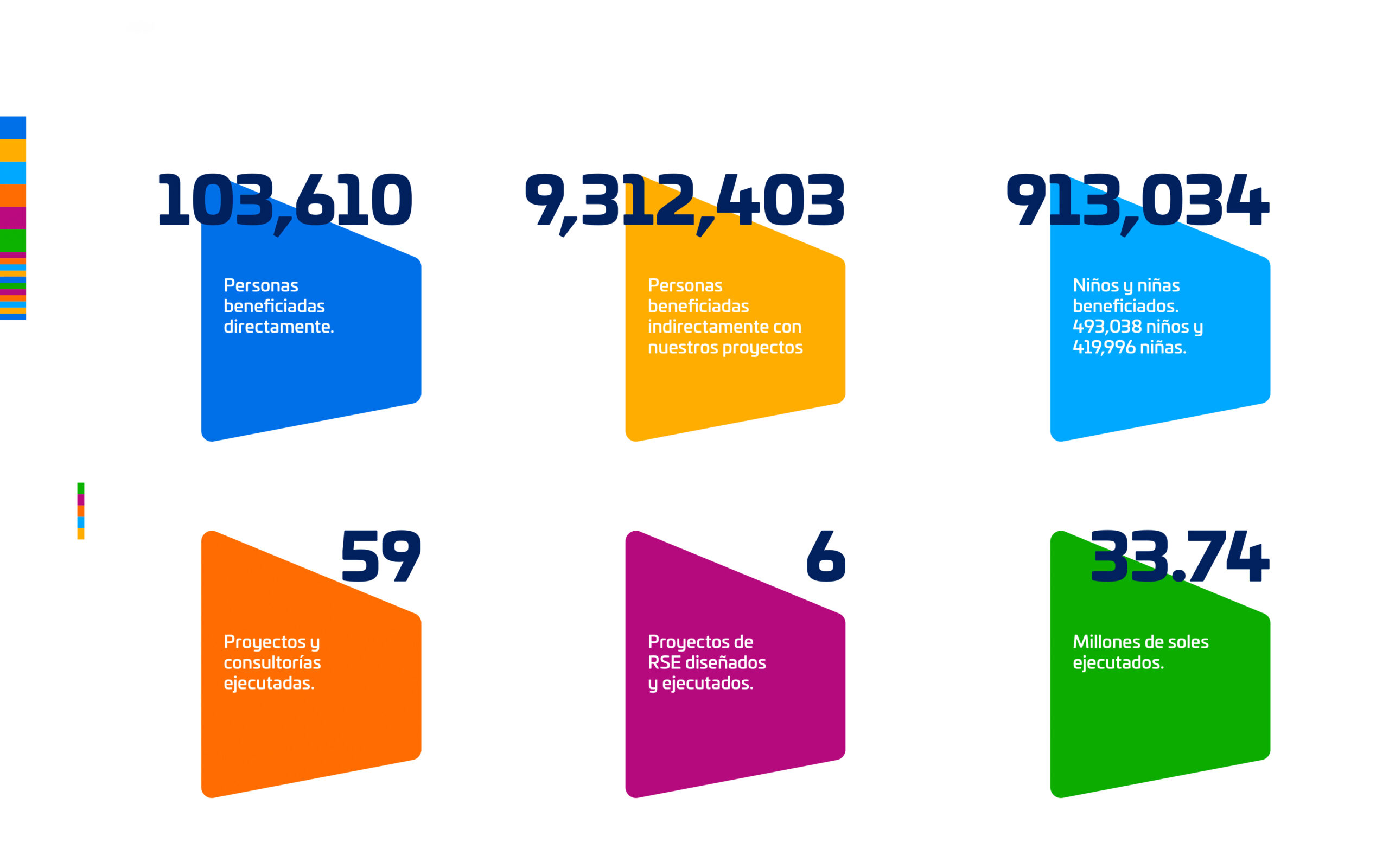 Durante este año hemos superado el estado de emergencia nacional y se ha experimentado una recuperación económica tras dos años de pandemia. En este contexto, podemos decir que como institución hemos contribuido a estos logros mediante el diseño e implementación de 59 proyectos y estudios de investigación. Estos proyectos han beneficiado directamente a 103,610 personas, 913,034 niños y niñas. Además, han tenido un impacto indirecto en más de 9 millones de personas en 15 regiones del país.