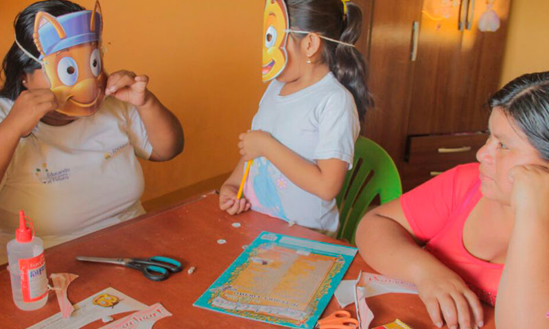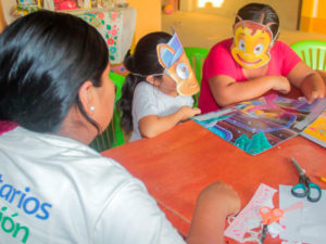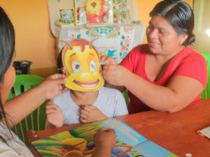 Inicia la visita, un cuento para empezar, saca una máscara y se convierte en la mamá abeja, primero lo hace ella y luego es el turno de la mamá de Anyi. América le enseña cómo hacerlo, le da confianza, “vamos pierda los nervios, verá que también se divierte”.