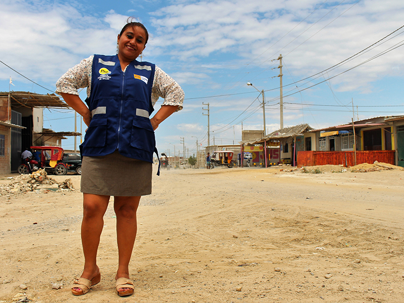 Seguimos recorriendo Paita y en una de las amplias calles de arena del Asentamiento Humano María Consuelo Gonzáles de Velasco vive Sidia Ramírez Gómez (43 años), Agente Comunitaria de Salud, quien se pone su chaleco, alista su tablero con sus fichas de monitoreo de visita domiciliaria y su lapicero para salir a realizar las visitas domiciliarias de salud a familias de los niños y niñas beneficiarios del Programa Creciendo Sano en su comunidad, como toda una aguerrida soldado dispuesta a cumplir con su misión.