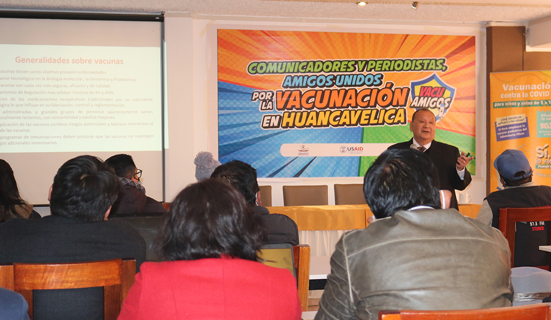 Con la participación de más de 50 comunicadores, periodistas, responsables de inmunizaciones y de promoción de la salud de Acobamba, Angaraes, Castrovirreyna, Churcampa, Tayacaja y Huancavelica, se realizó el pasado 8 de junio del 2022, el taller de capacitación “Comunicadores y periodistas amigos unidos por la vacunación en Huancavelica” organizado por Prisma ONG y la Dirección Regional de Salud de Huancavelica, con el apoyo de USAID.