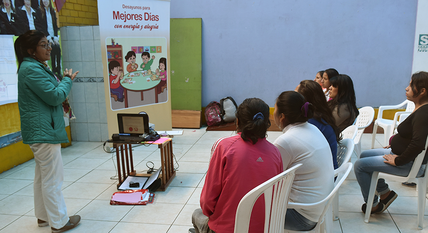 Mientras la nutricionista del programa “Desayunos para Mejores Días con Energía y Alegría” explica los alimentos que contienen más hierro para combatir la anemia en los niños y niñas, las madres de familia miran atentas y anotan en una hoja de papel una lista de alimentos; otras levantan la mano para preguntar cómo incluir o preparar determinados alimentos en el día a día para mejorar la dieta de sus hijos. Es una mañana diferente: acaba de empezar el segundo taller con padres de familia de la Institución Educativa Inicial 116 San Pablo en el Cercado de Lima.