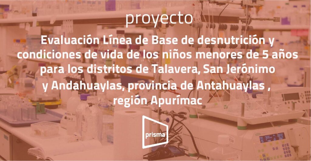 Objetivo: Contar con una Línea de base de desnutrición y condiciones de vida de la población infantil menor de 5 años de los distritos Talavera, San Jerónimo y Andahuaylas. Sus objetivos específicos son: identificar los aspectos socio-culturales de la población; determinar indicadores de la condición nutricional de los niños menores de 5 años; proponer acciones